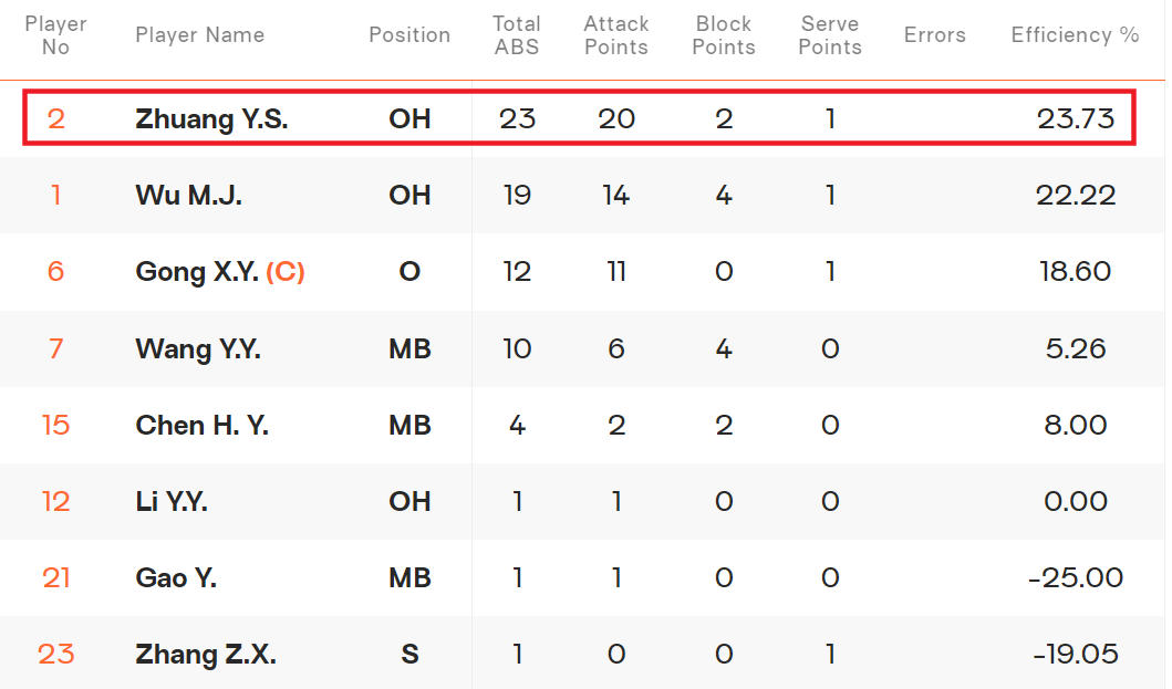 庄宇珊40扣20中,只有2次扣球失误,还有2次拦网得分和1次发球得分,打出了全能表现。相比征战女排世界联赛时期,中国女排对首发进行了调整,李盈莹取代吴梦洁首发,高意取代陈厚羽首发。不过,中国女排的这个调整有些失败。李盈莹刚刚伤愈归来,还需要找状态,李盈莹6扣1中,得到1分。赵勇及时换人,第一局就用吴梦洁换下李盈莹。